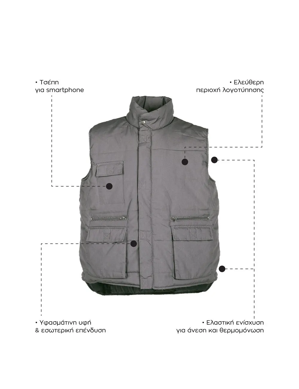 Λεπτομέρειες: Κλείσιμο με φερμουάρ – Ψηλός γιακάς, ελαφρώς ενισχυμένος – 5 τσέπες μπροστά, 2 με καπάκι, 2 με φερμουάρ και 1 τσέπη κινητού στο στήθος – Εσωτερική τσέπη – Πατιλέτα με velcro και κουμπί