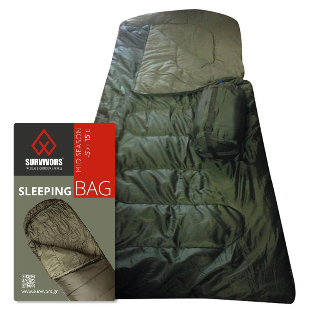 Υπνόσακος Mid Season -5/+15 °C Survivors Λαδί. Υπνόσακος στρατιωτικός με μαξιλάρι (κουκούλα) στο άνω μέρος Ανοίγει εντελώς και μπορεί να γίνει και πάπλωμα…