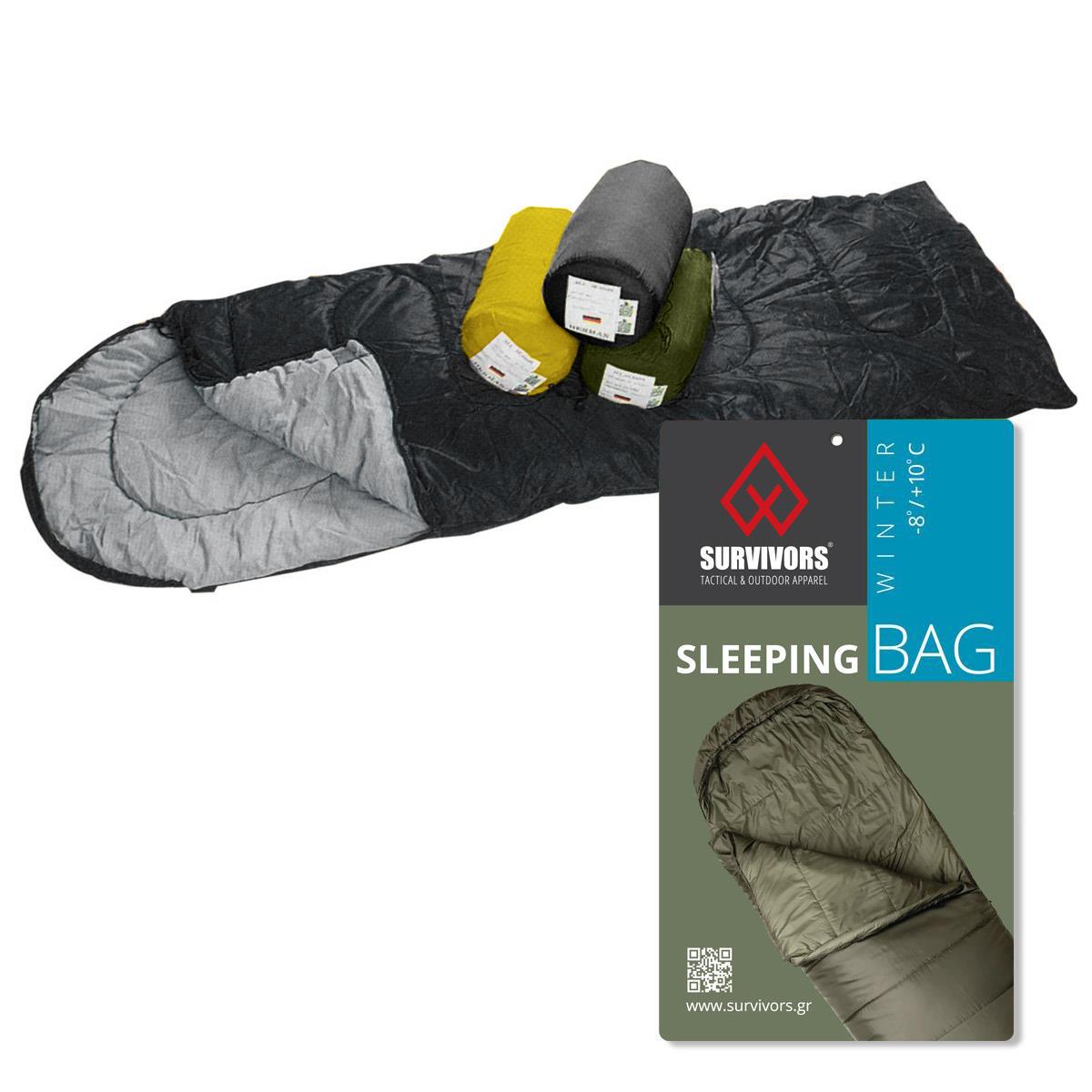 Υπνόσακος Winter -8/+10 °C ( 400gr ) Survivors Μαύρος, στρατιωτικός με μαξιλάρι (κουκούλα) στο άνω μέρος Ανοίγει εντελώς και μπορεί να γίνει και πάπλωμα.