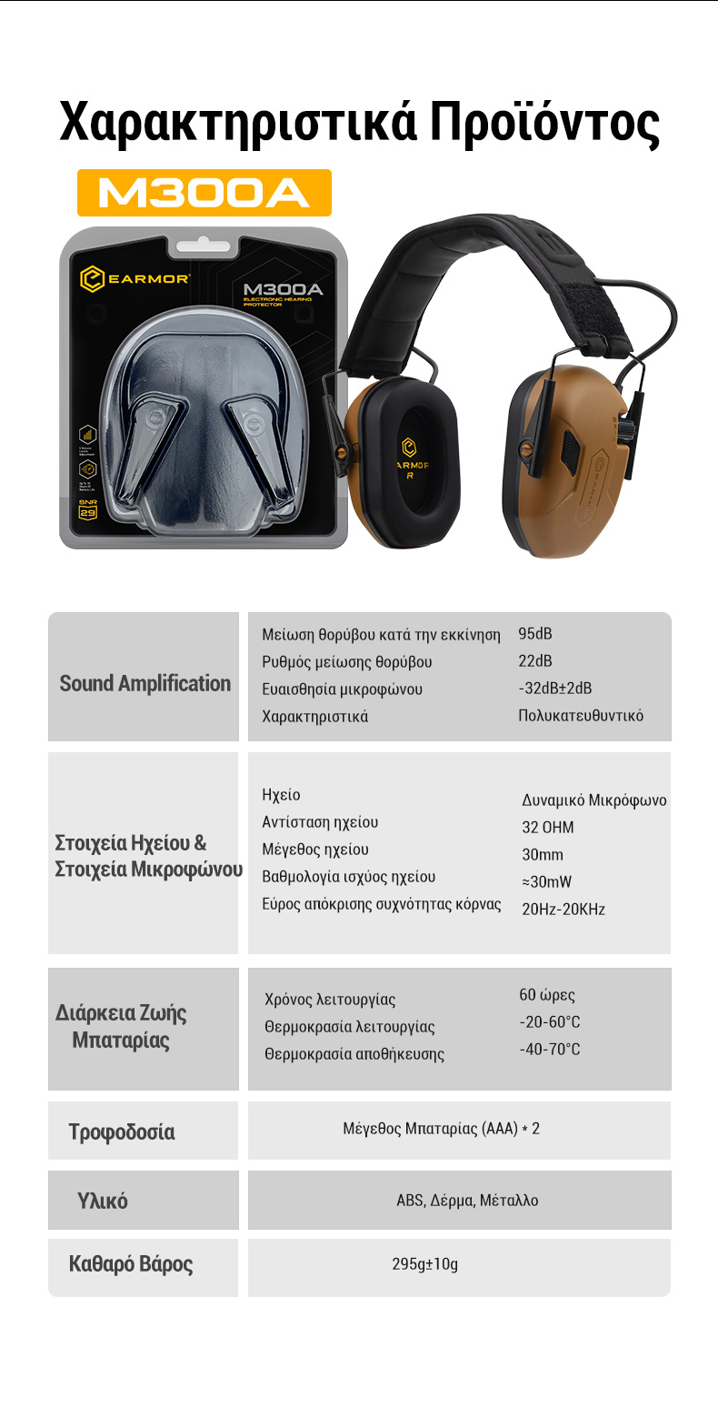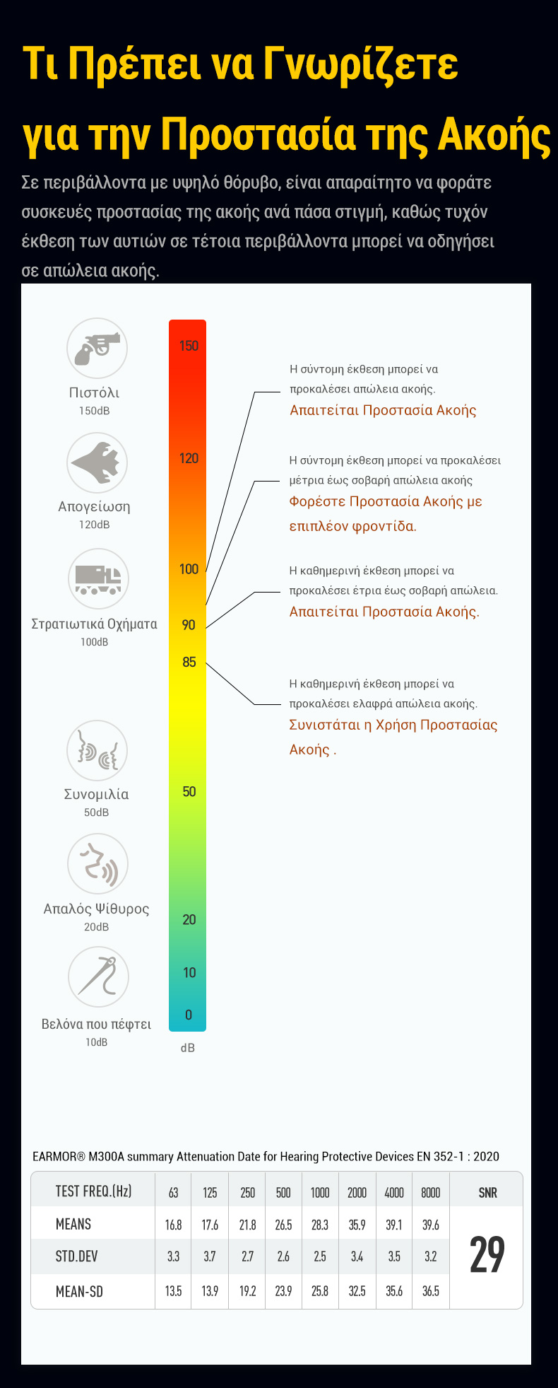 Οι ωτοασπίδες EARMOR ® M300A είναι ακουστικά ακύρωσης θορύβου που έχουν σχεδιαστεί για να παρέχουν στους χρήστες ασφαλή και αξιόπιστη προστασία ακοής.